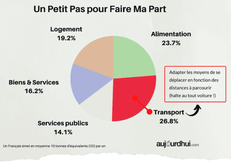 Si tu veux faire ta part, tu peux tenter de t’organiser ces prochaines années pour adapter tes moyens de locomotion en fonction des distances. Par exemple (ce sont juste des exemples) : la marche ou le vélo pour les petits trajets, le vélo électrique ou une petite citadine électrique pour les trajets du quotidien, les transports en commun (quand ils existent) ou le covoiturage pour aller au travail et le train pour les longues distances.