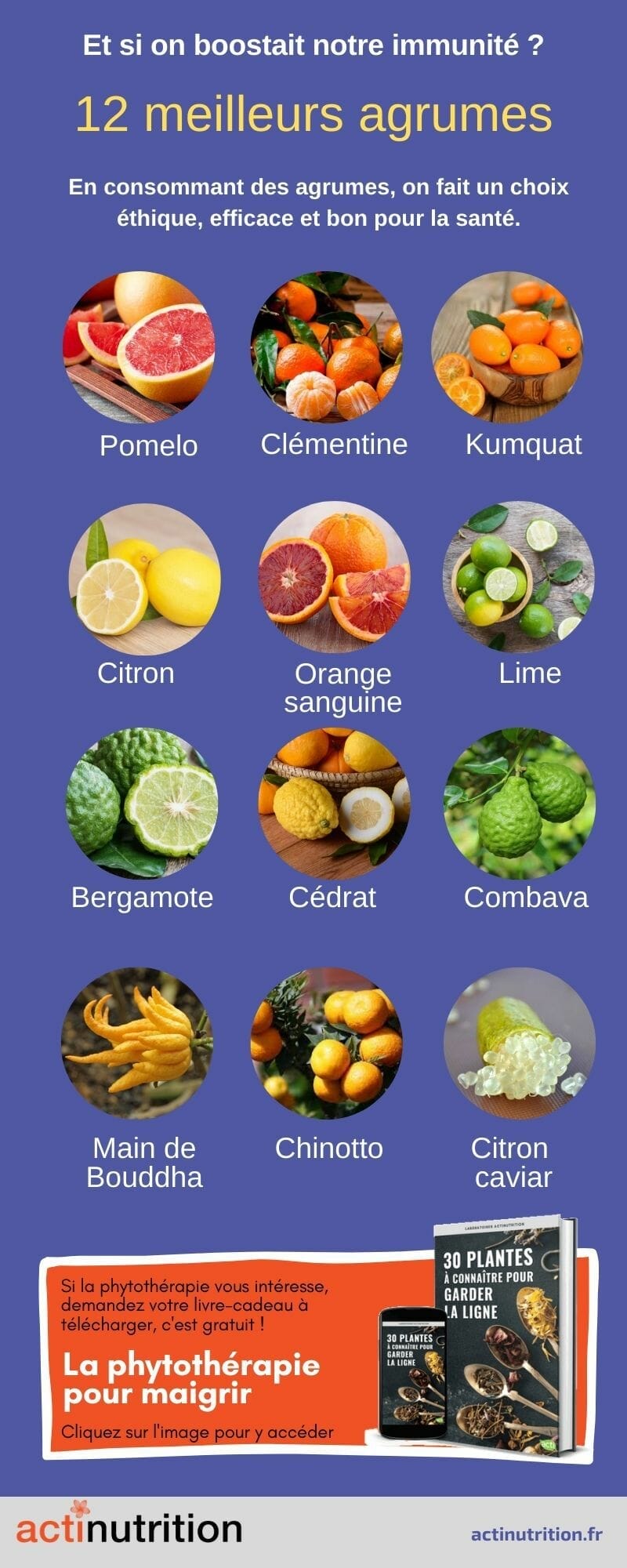 La longue liste des agrumes comprend des fruits réputés pour leur teneur en vitamine C. On en compte en moyenne 35 à 55 mg pour 100 g selon les variétés soit la moitié des apports journaliers recommandés.