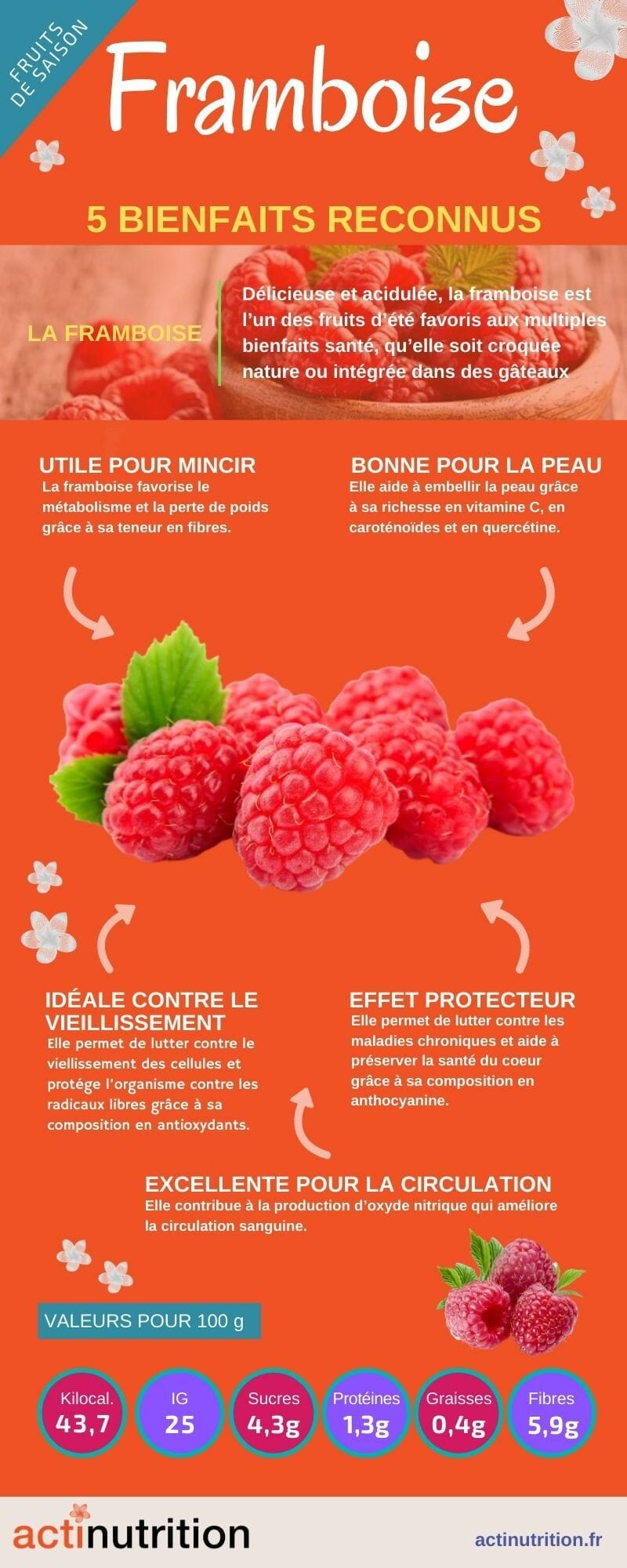 - La framboise permet de lutter contre les maladies chroniques et aide à préserver la santé du cœur grâce à sa composition en anthocyanine.