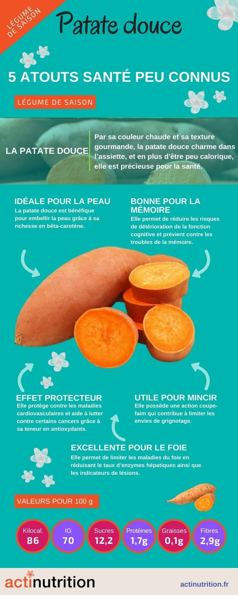 La patate douce est riche en potassium, un minéral utile pour le système nerveux, la fonction musculaire et la pression sanguine. Grâce à sa richesse en vitamines (vitamines A, B2, B5, B6, C), minéraux (en cuivre et en manganèse) et antioxydants, la patate douce aide à prévenir le stress oxydatif.