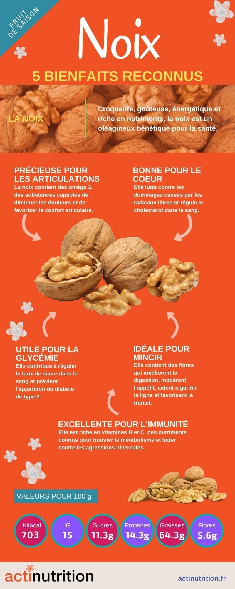 Avec un apport calorique élevé, la noix est plus riche en lipides que les cacahuètes et contient 70 % de matières grasses. De ce fait, 30 g de noix (7 noix) fournissent 100?% des apports quotidiens en Oméga-3 et une bonne quantité de cuivre, de manganèse, de magnésium et de vitamine B8.