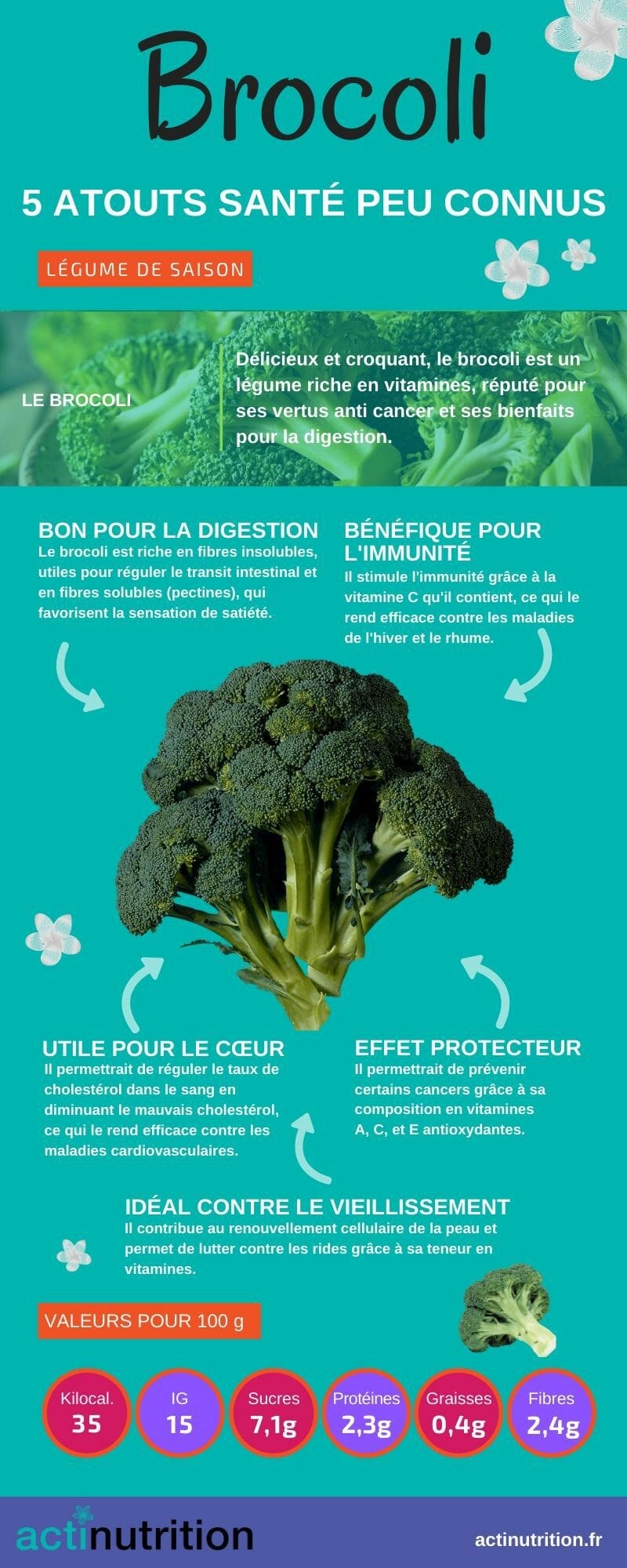 Le brocoli est peu calorique mais regorge de nutriments. Il est une bonne source de sels minéraux. Riche en fibres, en provitamine A, ainsi qu’en vitamines C et E il possède des vertus antioxydantes ce qui lui attribue une solide réputation anti cancer.