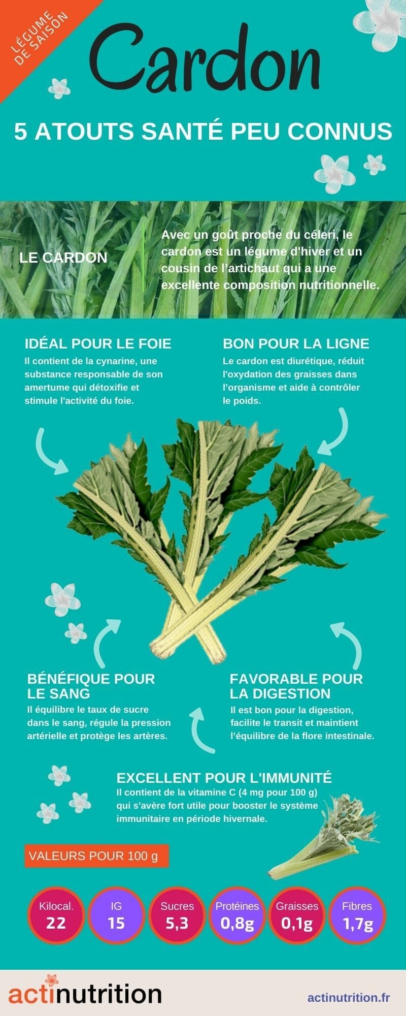 Le cardon a une teneur élevée en fibres qui favorisent la digestion. Il contient de l’inuline, un glucide qui est toléré par les personnes souffrant de diabète. Il renferme également des phyto-nutriments qui ont des propriétés antioxydantes et servent à protéger l’ADN.