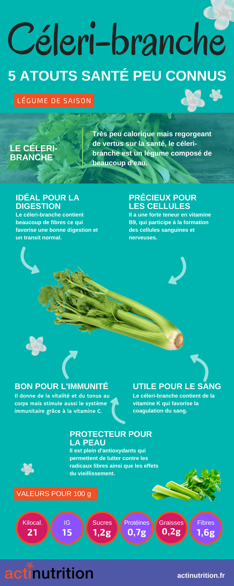 - Grâce à la vitamine C, le céleri-branche donne de la vitalité et du tonus à l’organisme et il stimule le système immunitaire