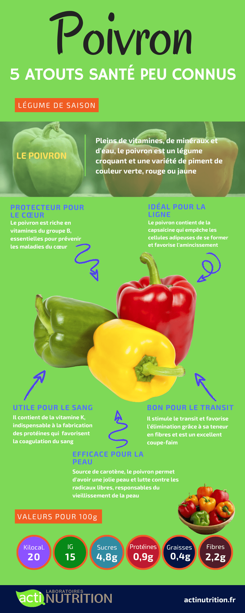 On le sait, le poivron est l’allié minceur par excellence. La capsaïcine qu’il contient stimule le métabolisme et empêche les cellules adipeuses immatures de se développer. Excellent coupe-faim, le poivron procure une sensation de satiété et constitue une aide précieuse dans les régimes minceur. Il possède un très faible apport énergétique faible.