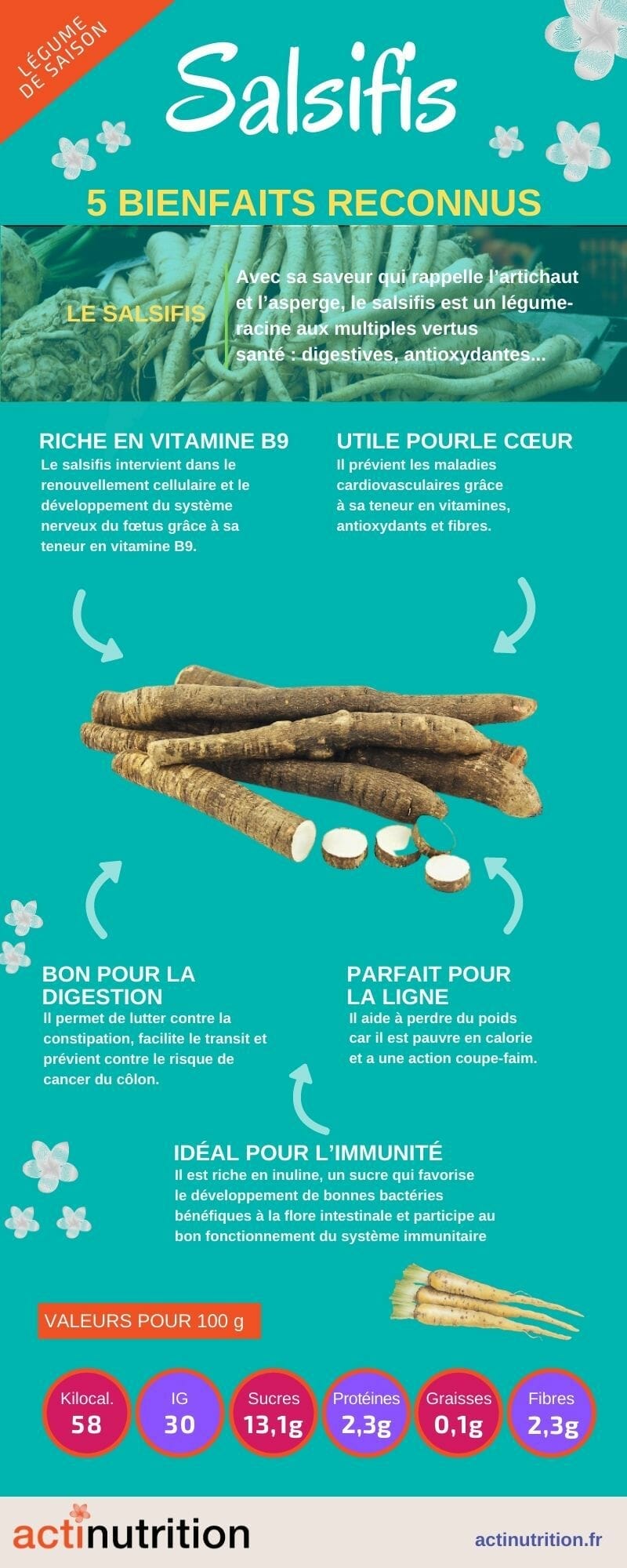 Le salsifis est un légume riche en inuline, un sucre qui favorise le développement de bonnes bactéries bénéfiques à la flore intestinale, comme les bifidobactéries. Il participe aussi au bon fonctionnement du système immunitaire et au contrôle des lipides sanguins.